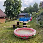 Chata Z Bali -Domek W Gorach ,Filipkowy Raj"- Limanowa Nowy Sacz Beskidy Krakow with the pool views also feature a satellite television, as well as ironing facilities. Along with a sofa set and a work desk, the interior features a stone fireplace. This Rozdziele property comes with a bathroom with a tub, a separate toilet, and a shower. There are a hair dryer and bath sheets for guests' comfort.